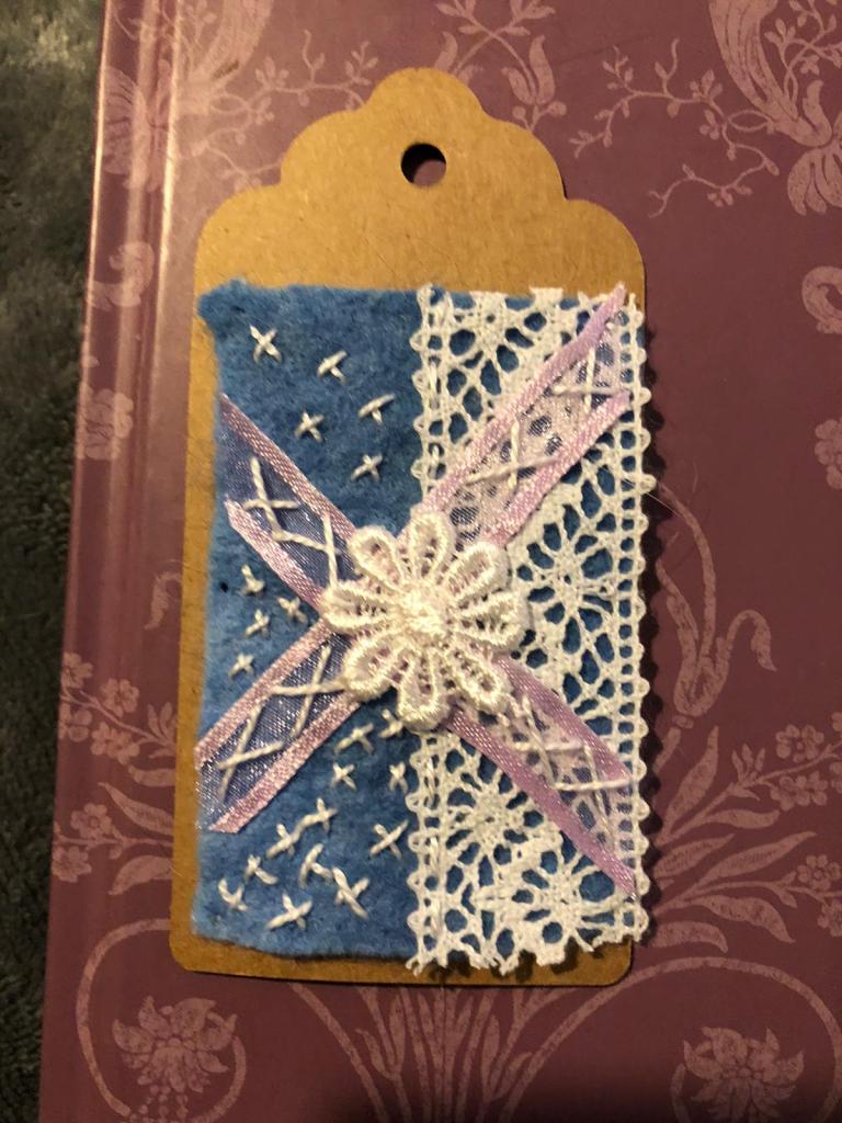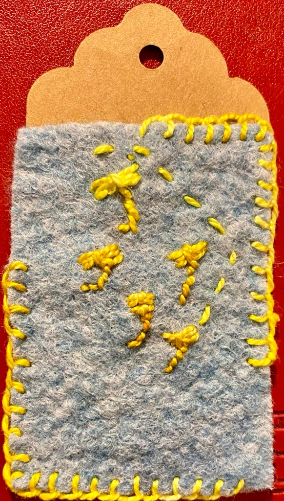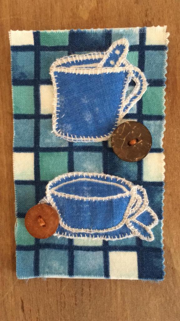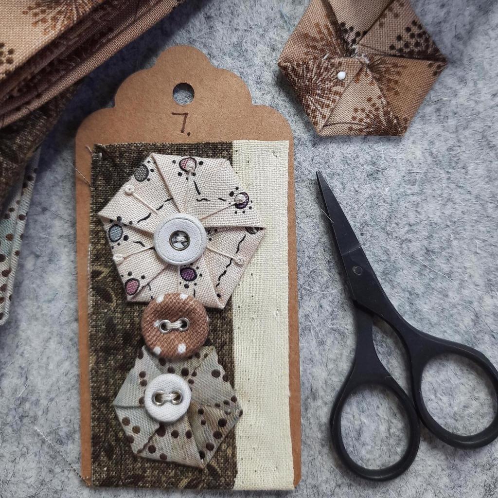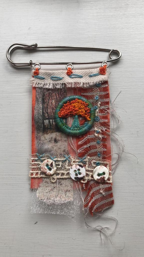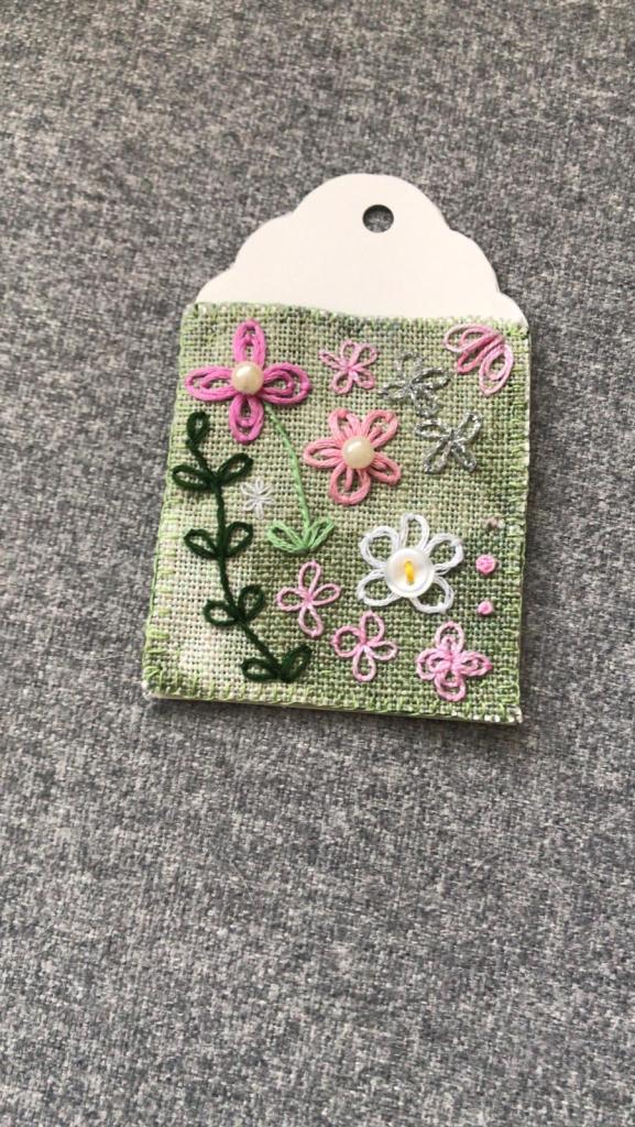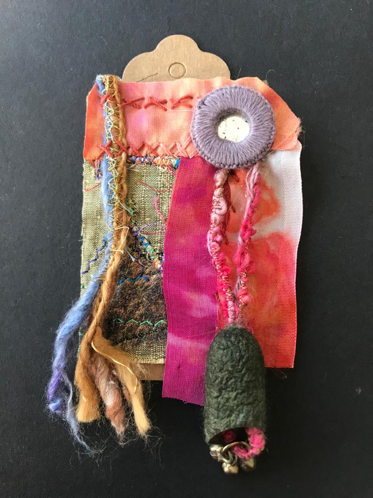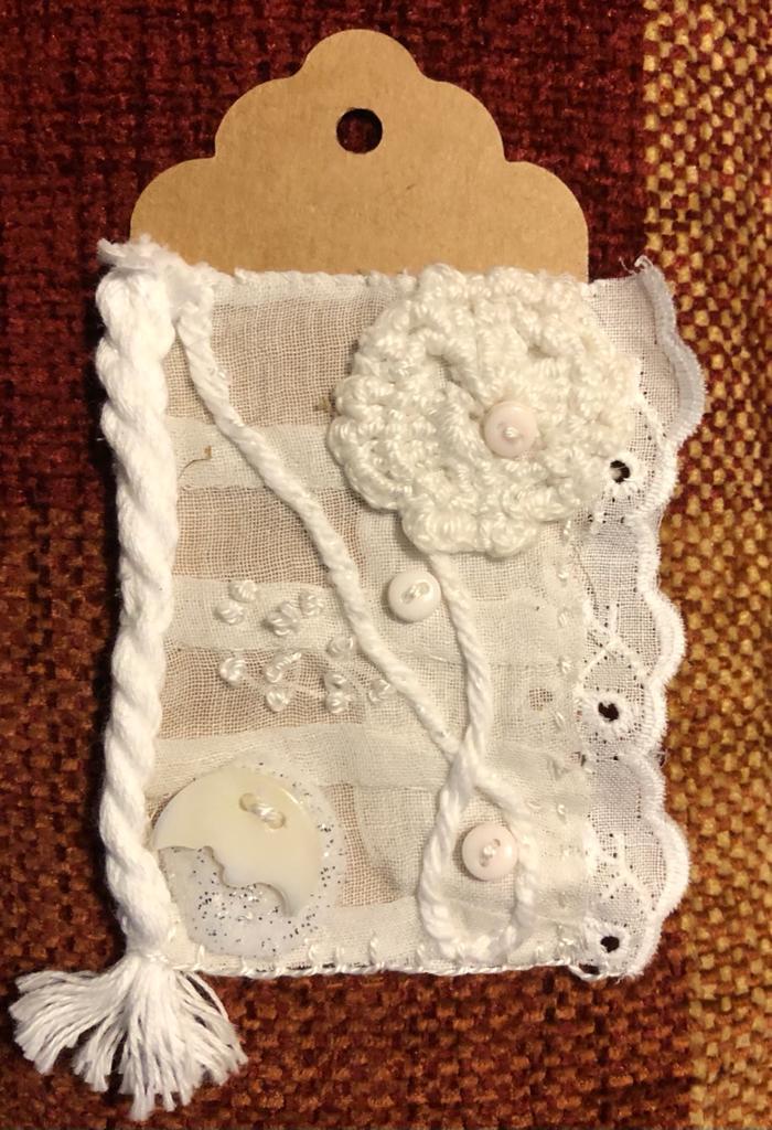 Our 2021 project was based on a challenge set by textile artist Anne Brooke, Sue V coordinated the project for our group. We created a series of mini stitched pieces, one a week for 52 weeks, each with a theme given by Anne Brooke which we attached to a luggage label or similar with the date and a memory of that week written on the reverse of the label.