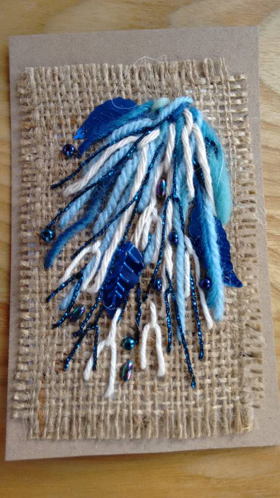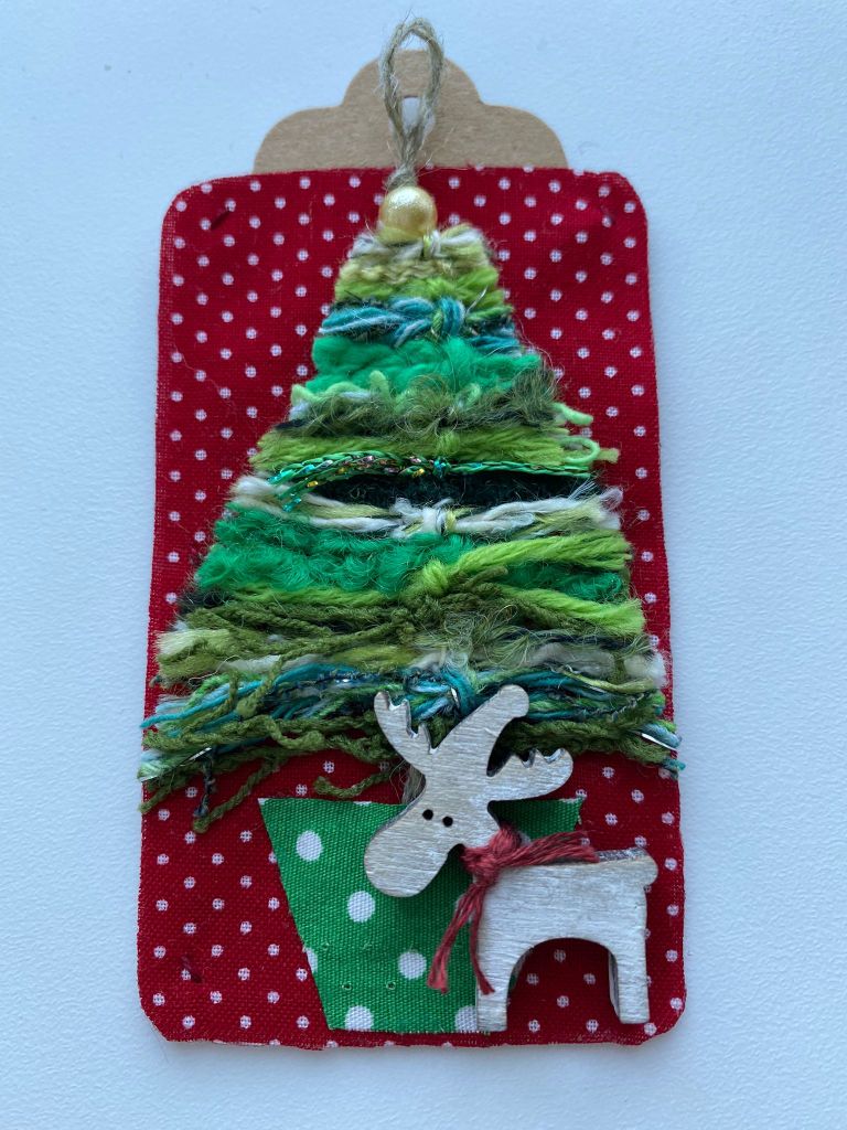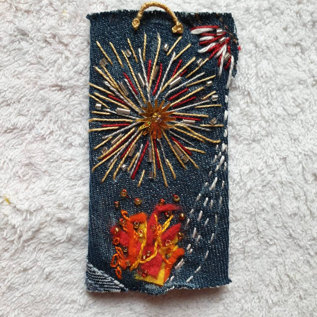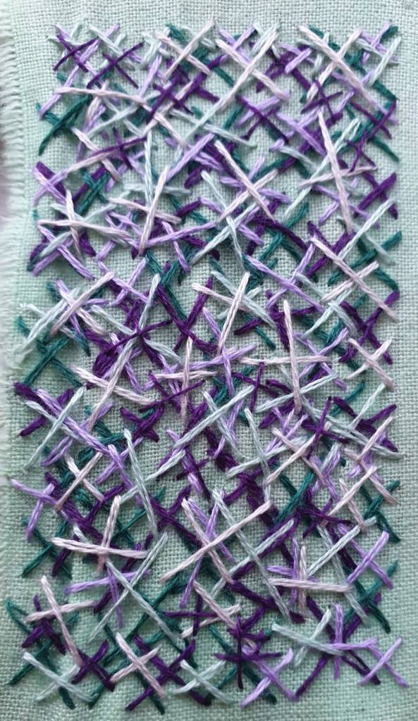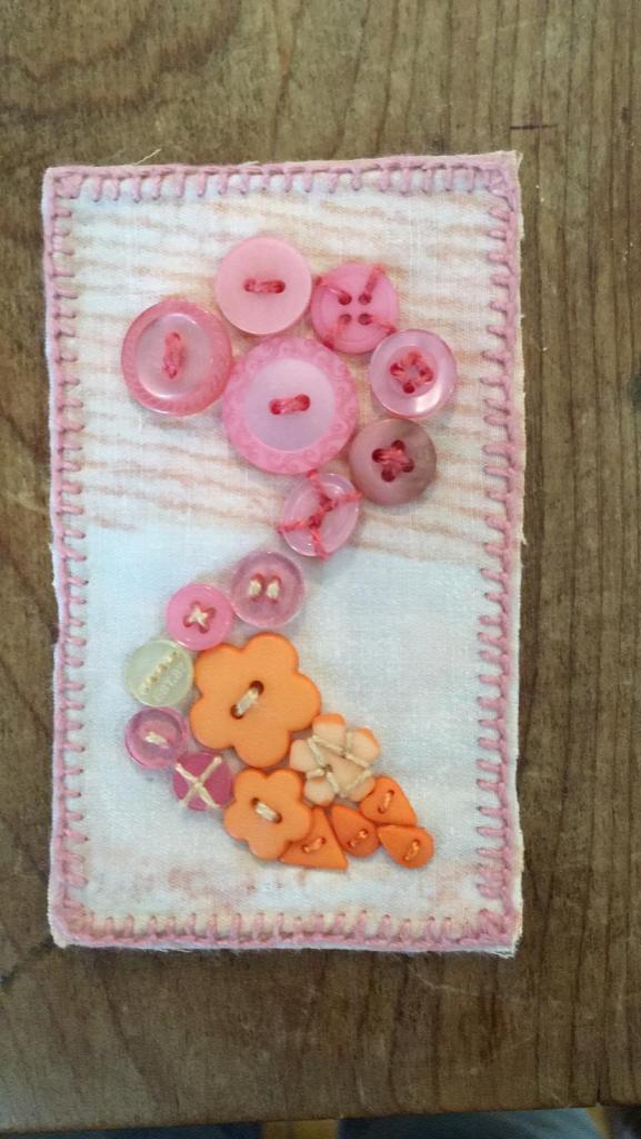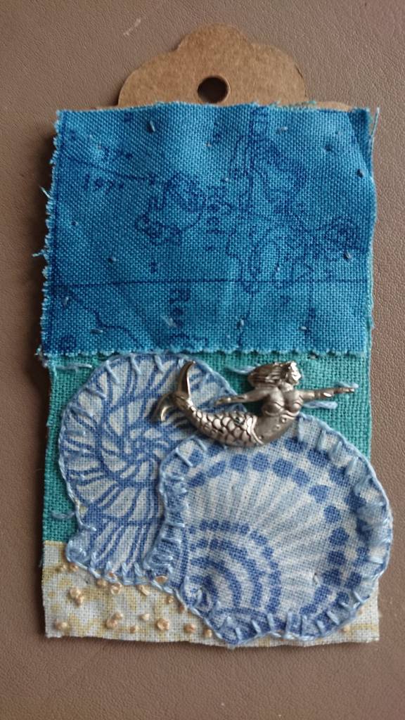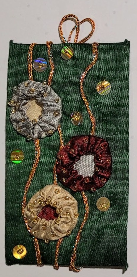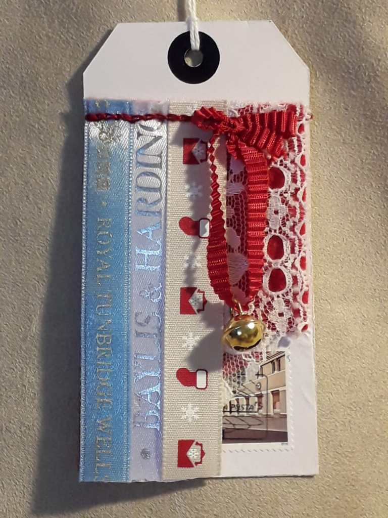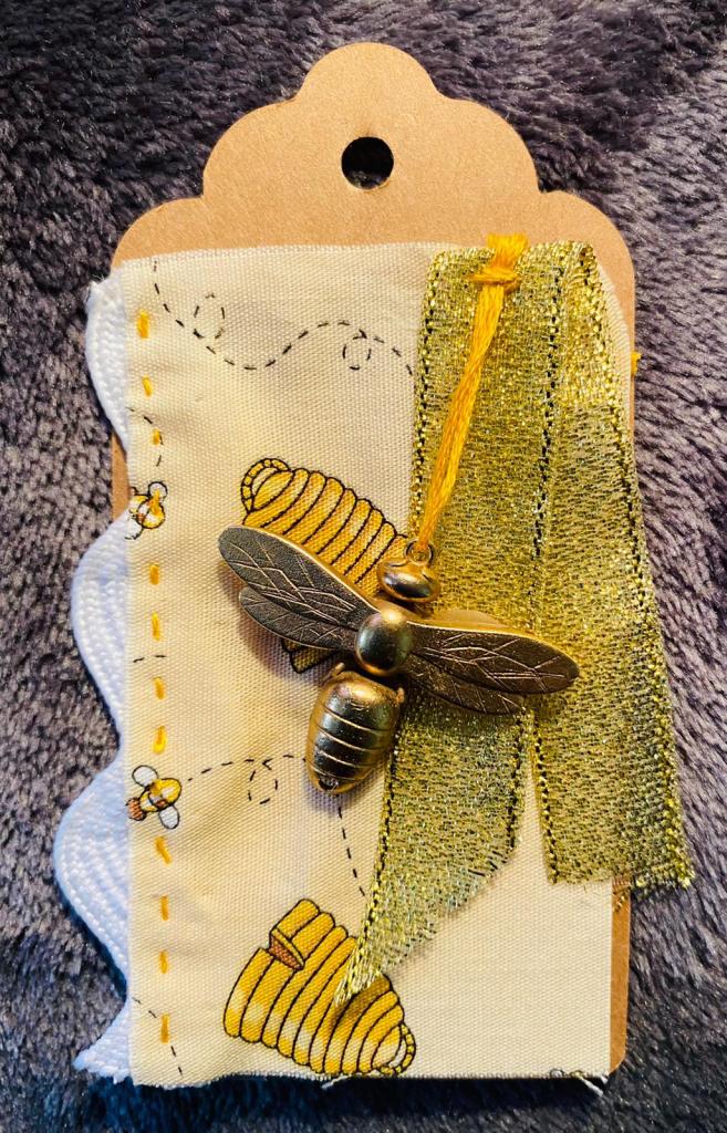 Our 2021 project was based on a challenge set by textile artist Anne Brooke, Sue V coordinated the project for our group. We created a series of mini stitched pieces, one a week for 52 weeks, each with a theme given by Anne Brooke which we attached to a luggage label or similar with the date and a memory of that week written on the reverse of the label.