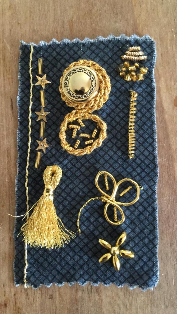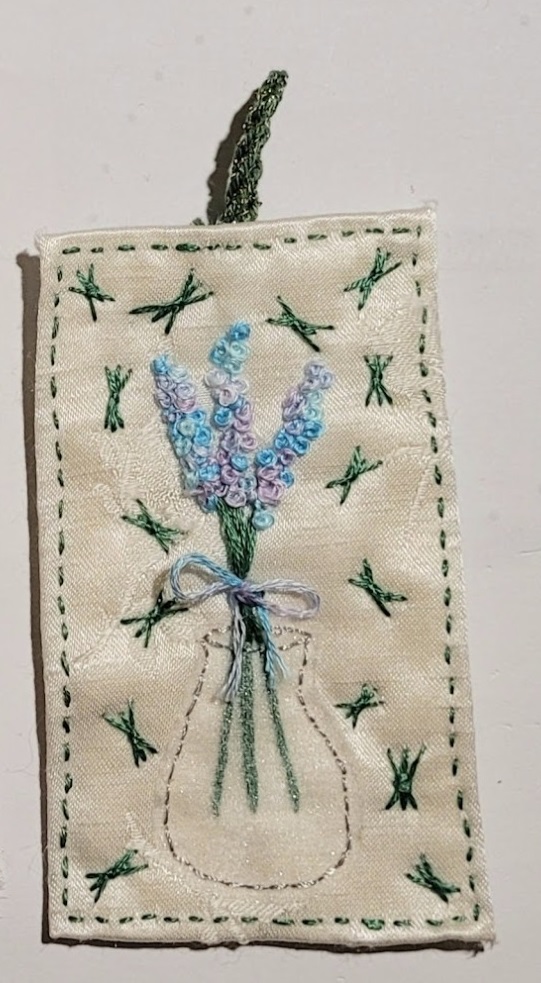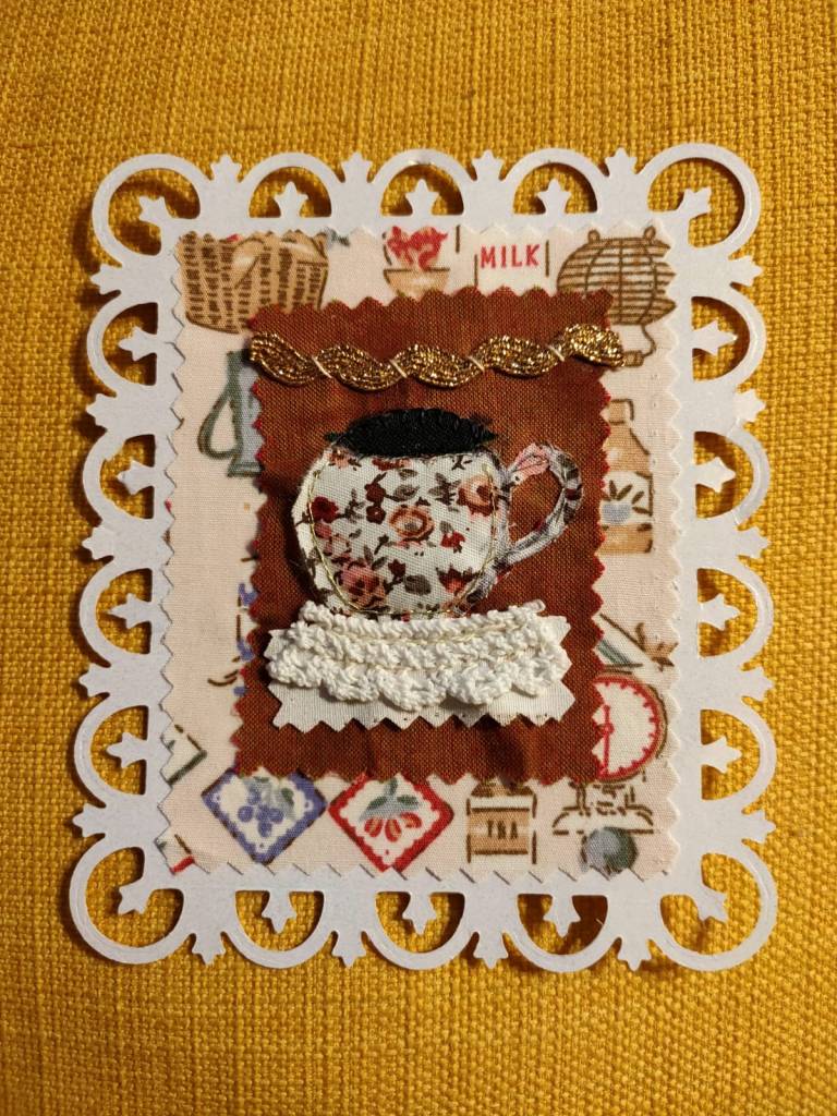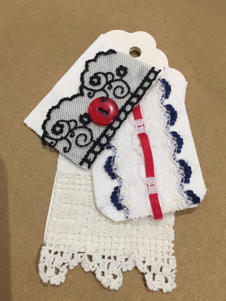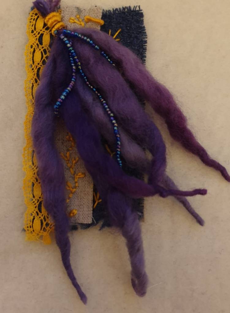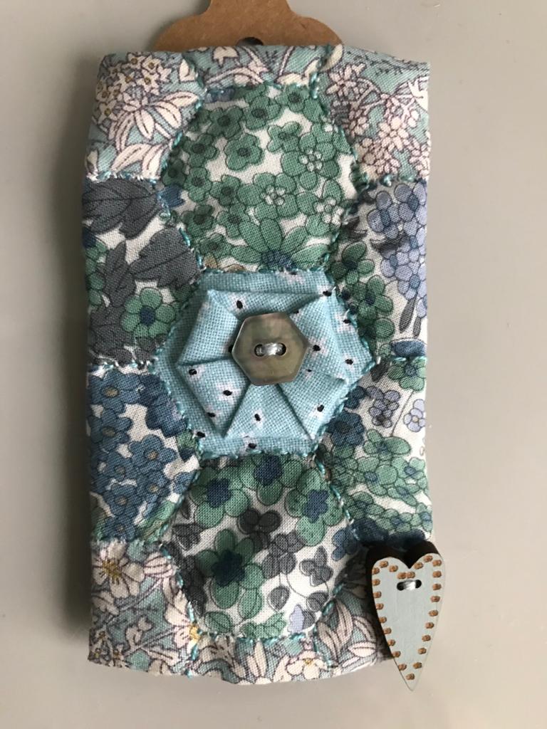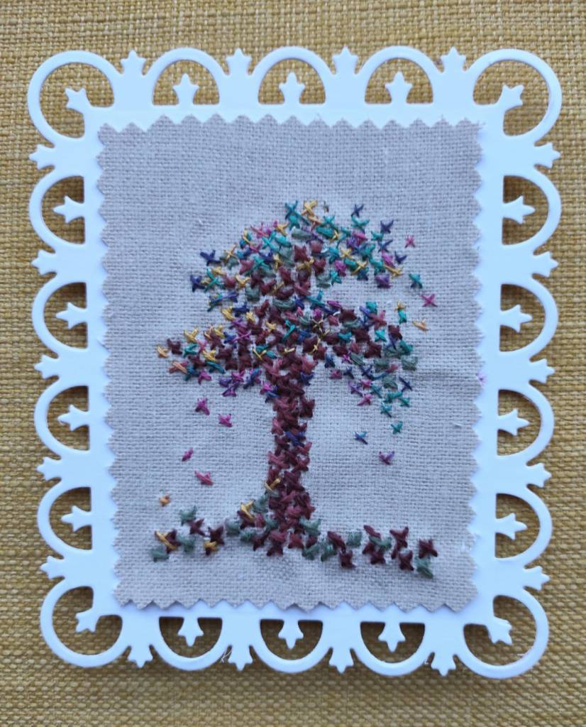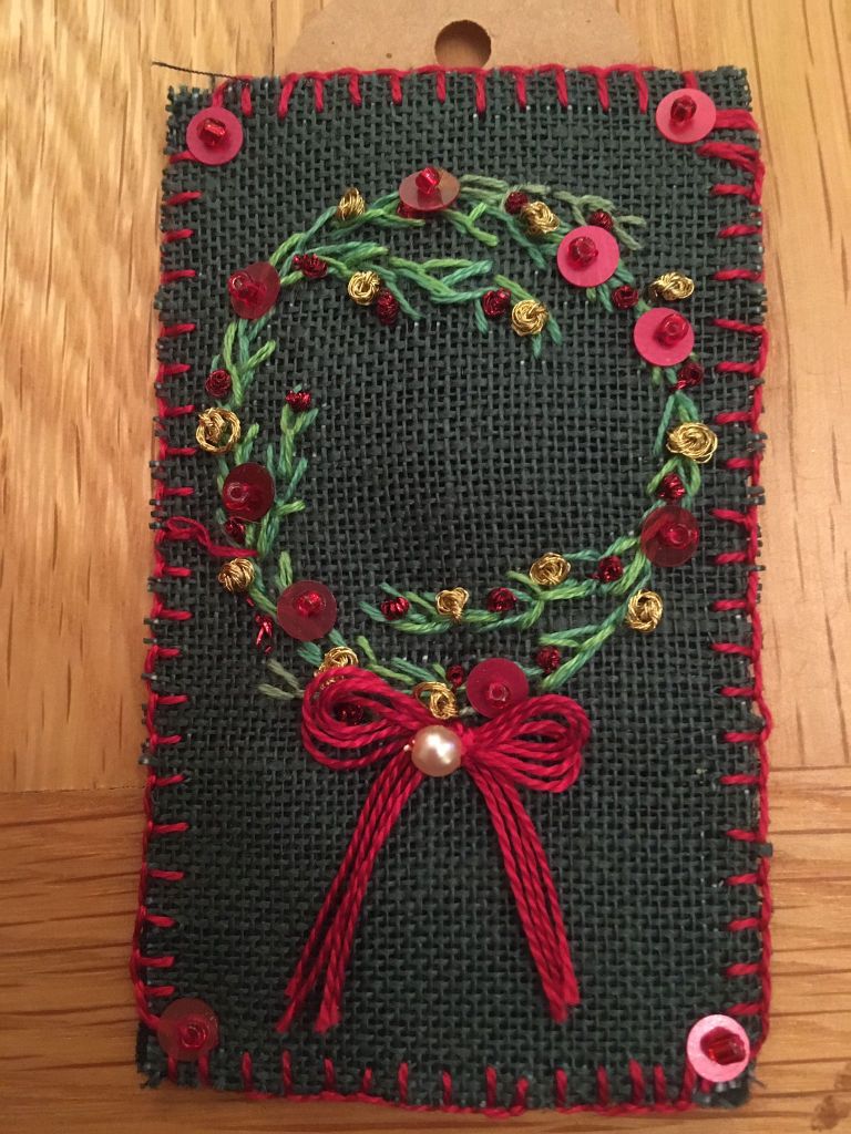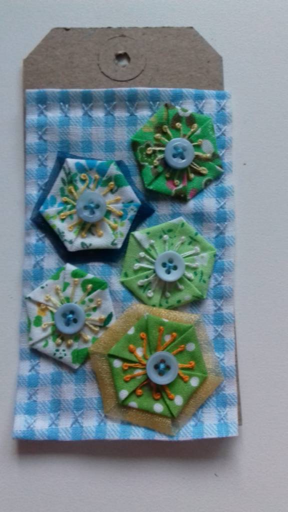 Our 2021 project was based on a challenge set by textile artist Anne Brooke, Sue V coordinated the project for our group. We created a series of mini stitched pieces, one a week for 52 weeks, each with a theme given by Anne Brooke which we attached to a luggage label or similar with the date and a memory of that week written on the reverse of the label.