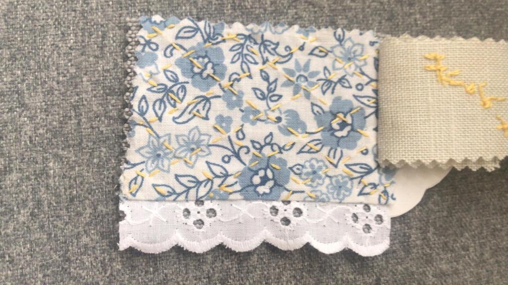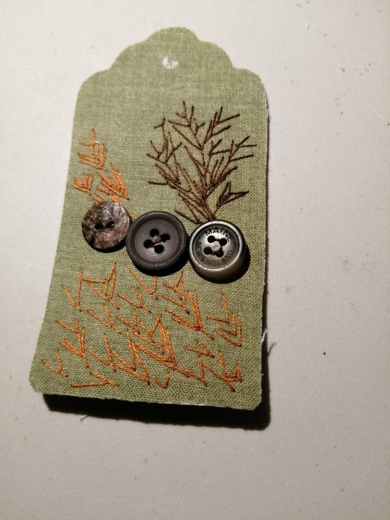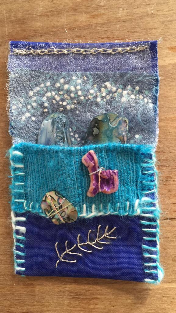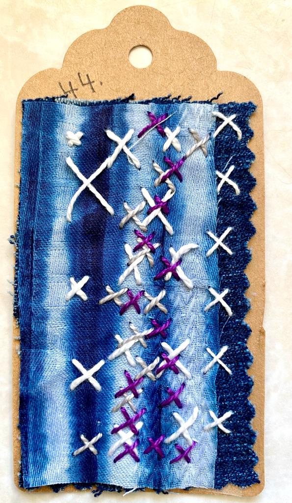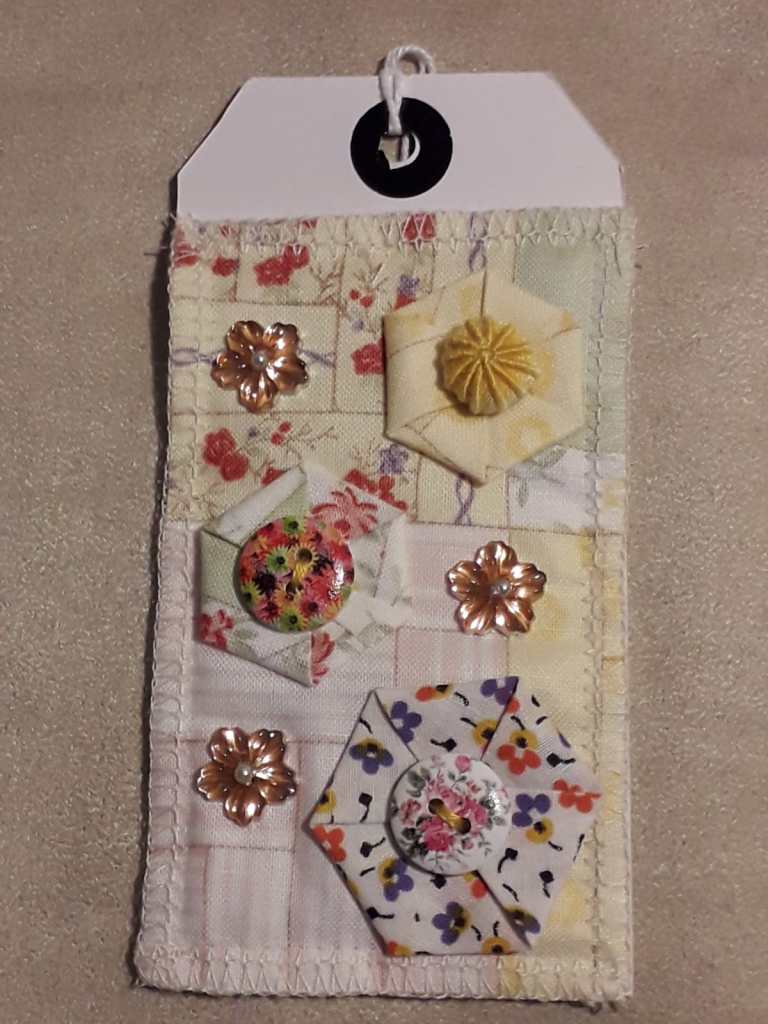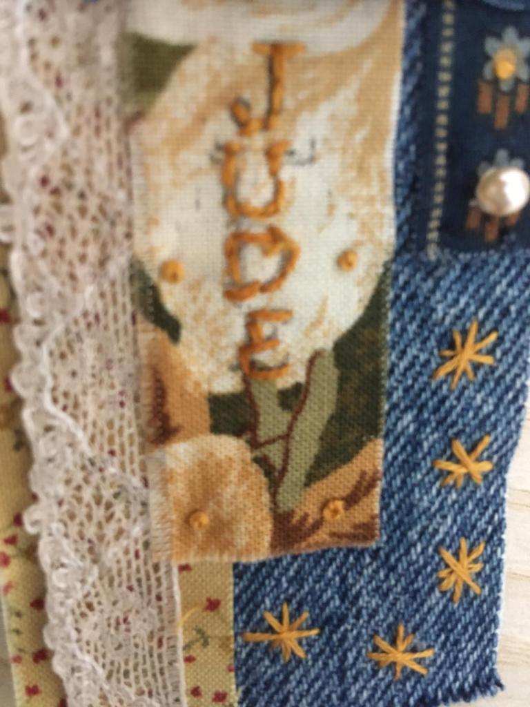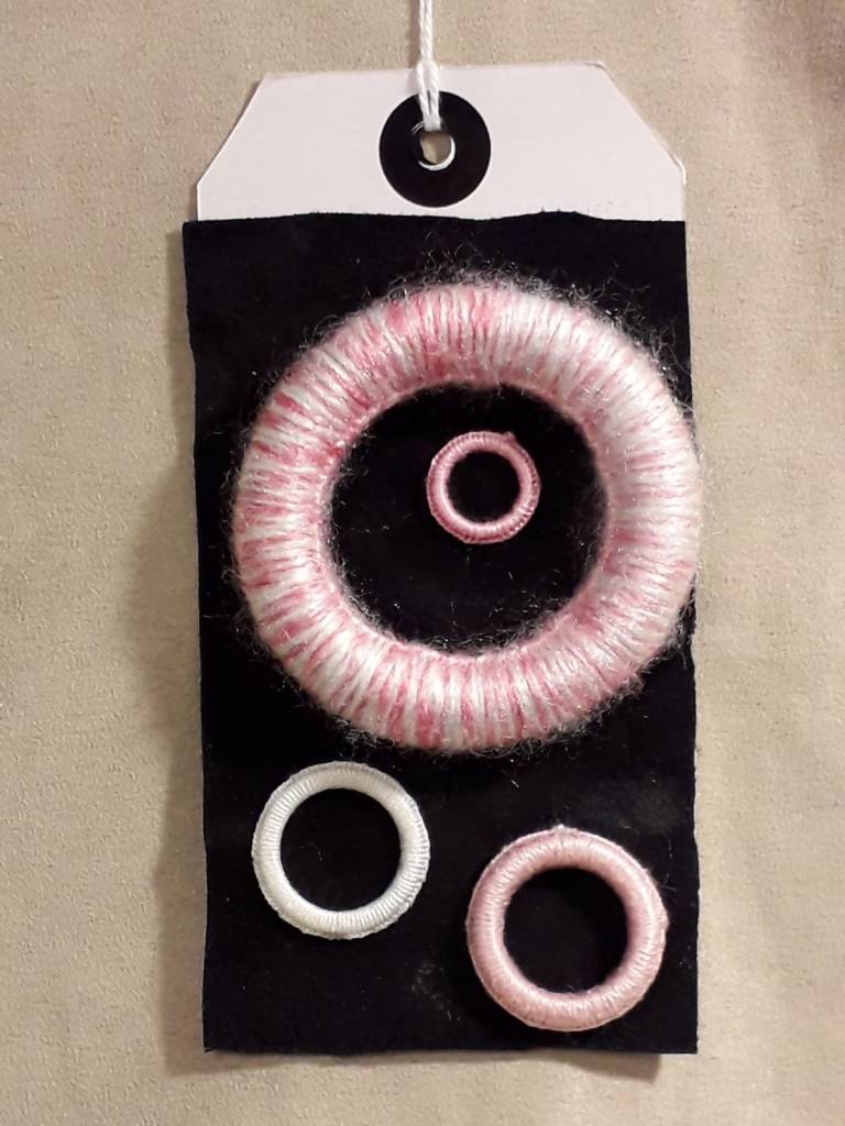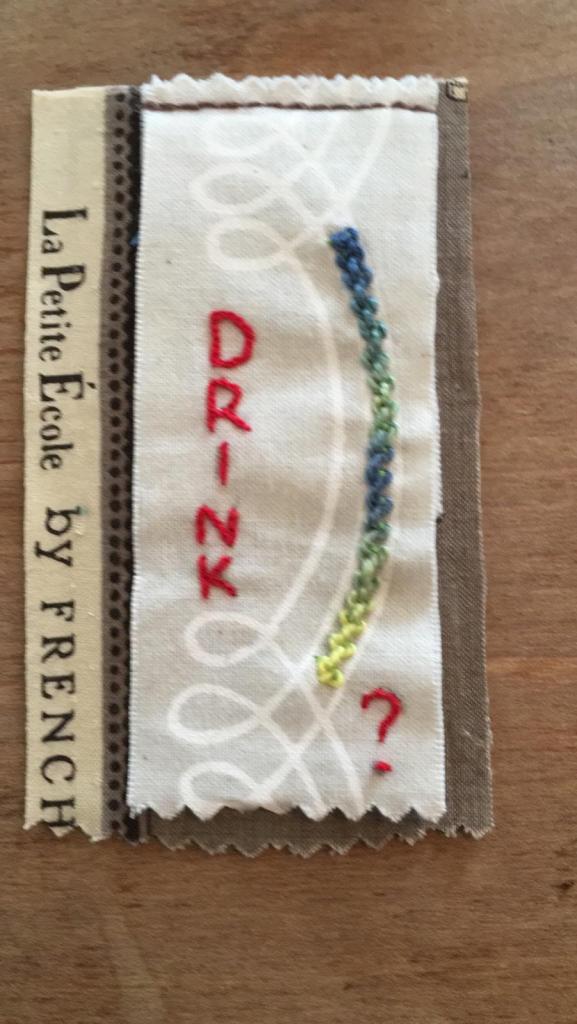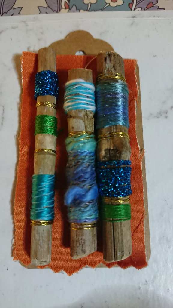 Our 2021 project was based on a challenge set by textile artist Anne Brooke, Sue V coordinated the project for our group. We created a series of mini stitched pieces, one a week for 52 weeks, each with a theme given by Anne Brooke which we attached to a luggage label or similar with the date and a memory of that week written on the reverse of the label.