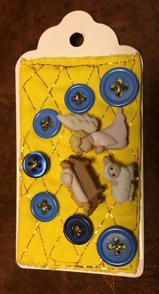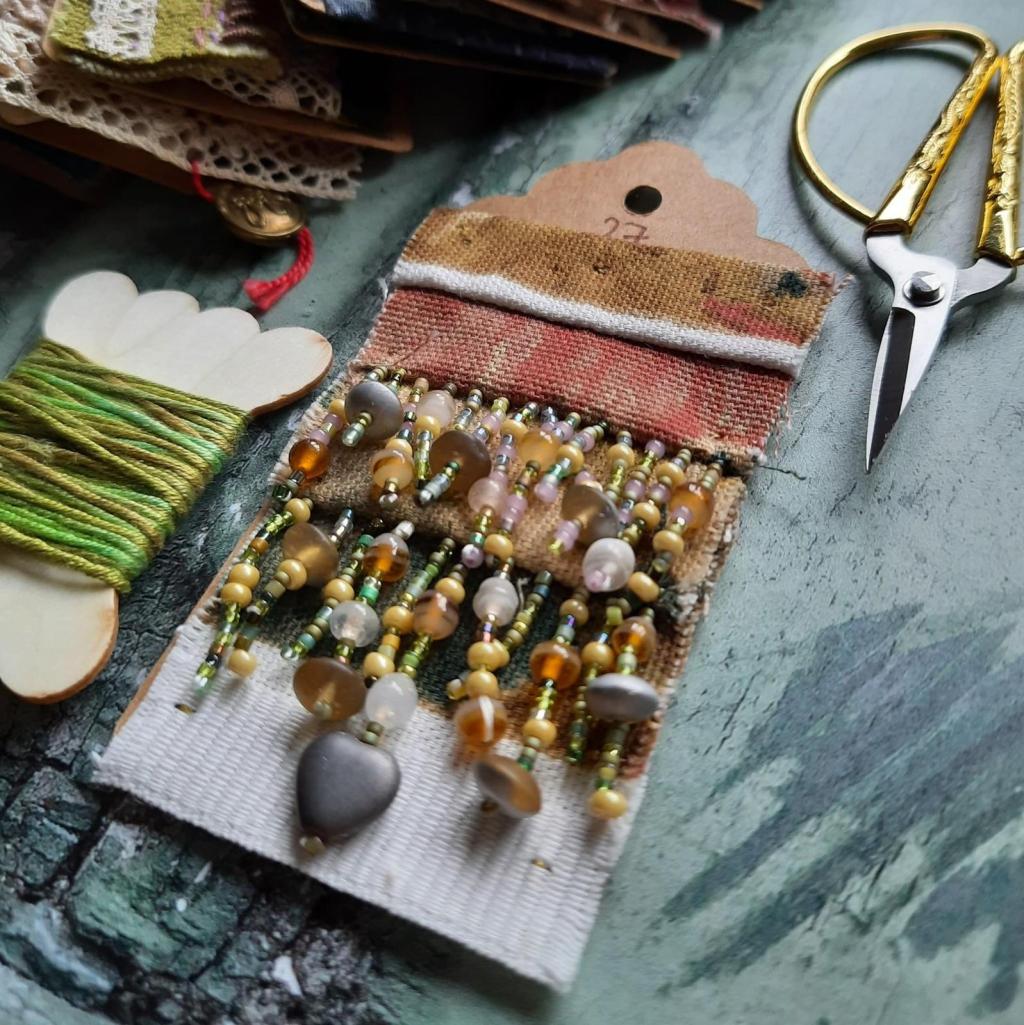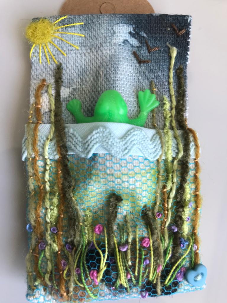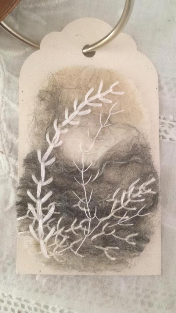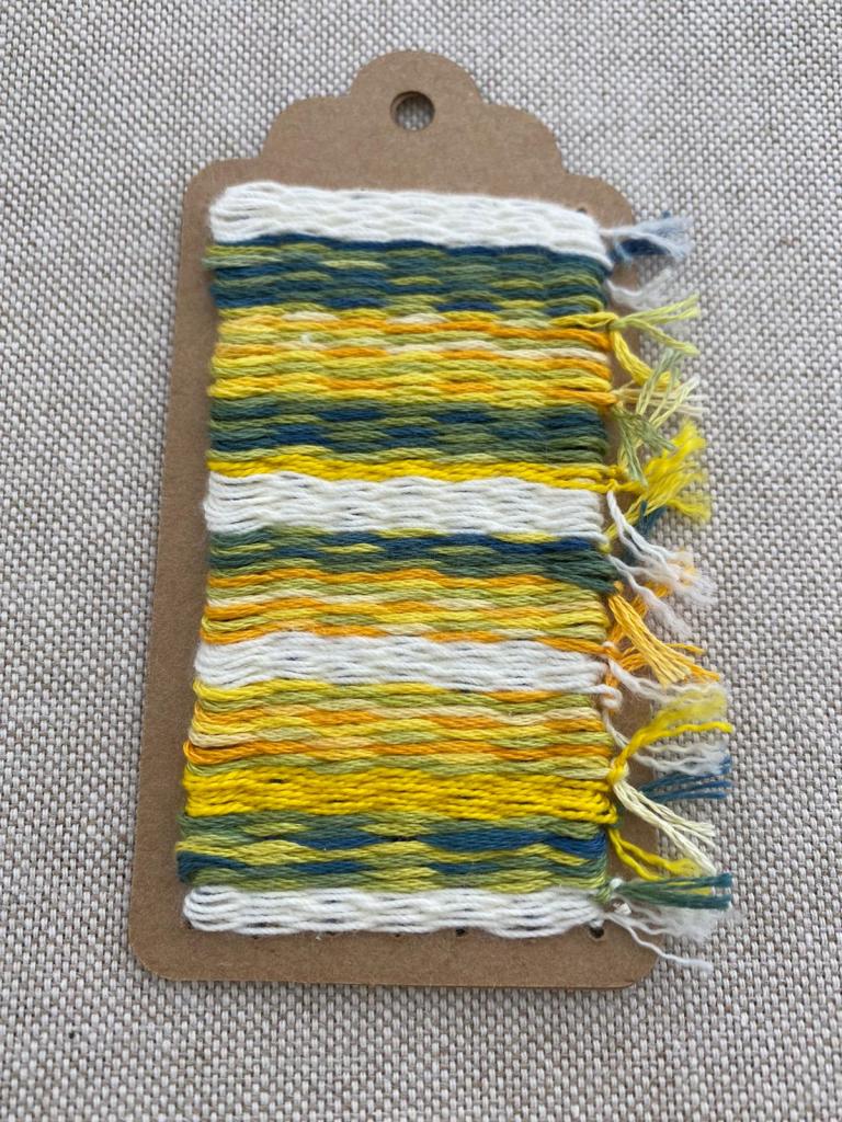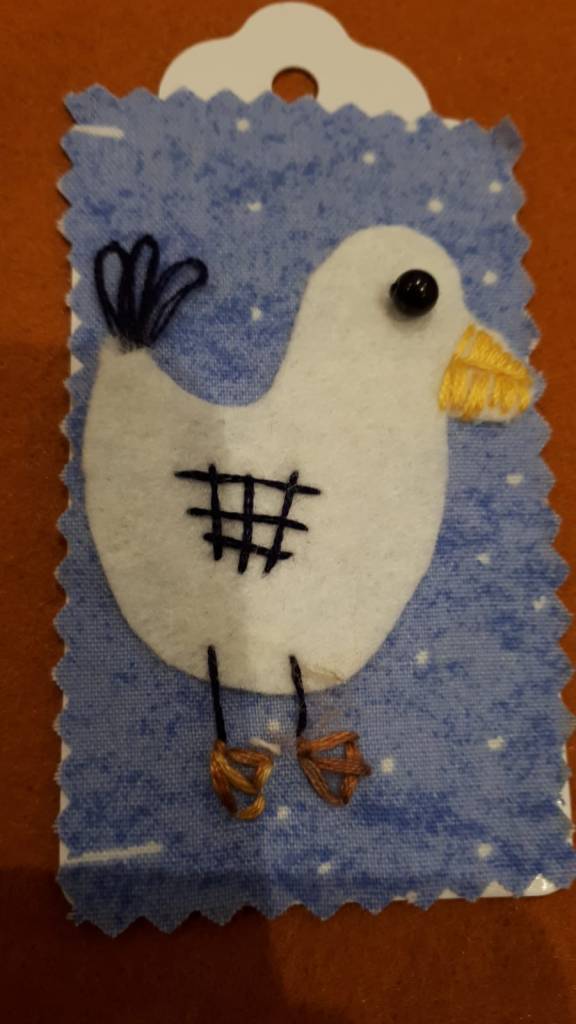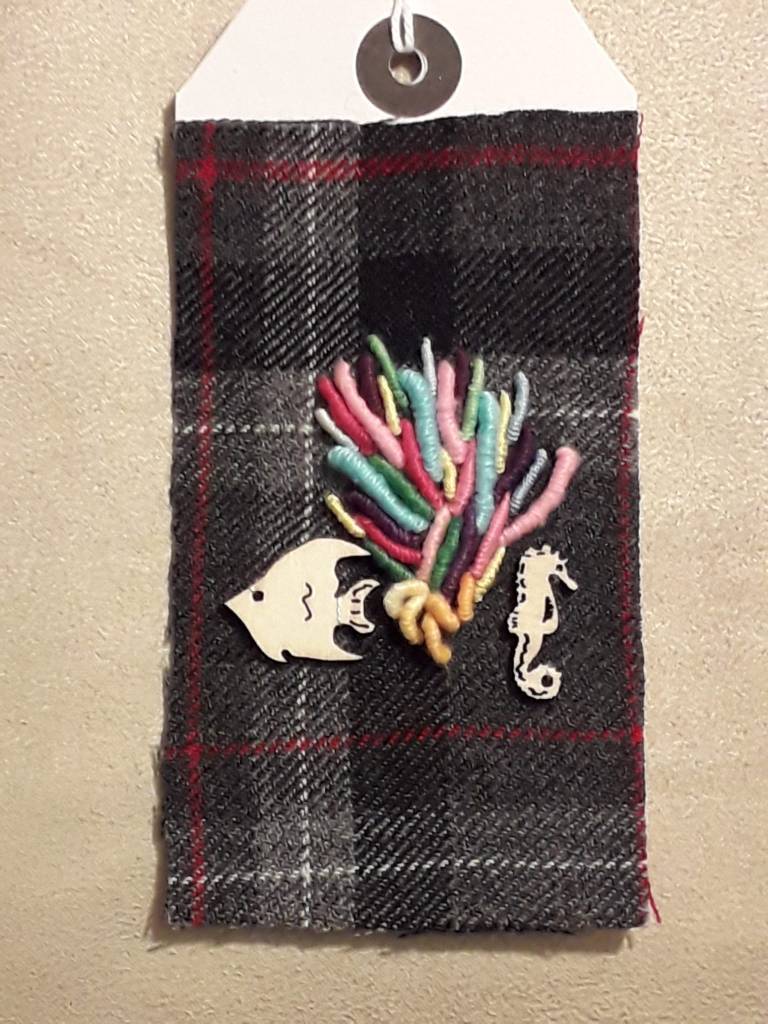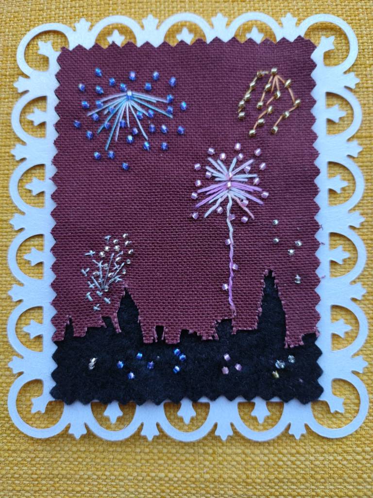 Our 2021 project was based on a challenge set by textile artist Anne Brooke, Sue V coordinated the project for our group. We created a series of mini stitched pieces, one a week for 52 weeks, each with a theme given by Anne Brooke which we attached to a luggage label or similar with the date and a memory of that week written on the reverse of the label.