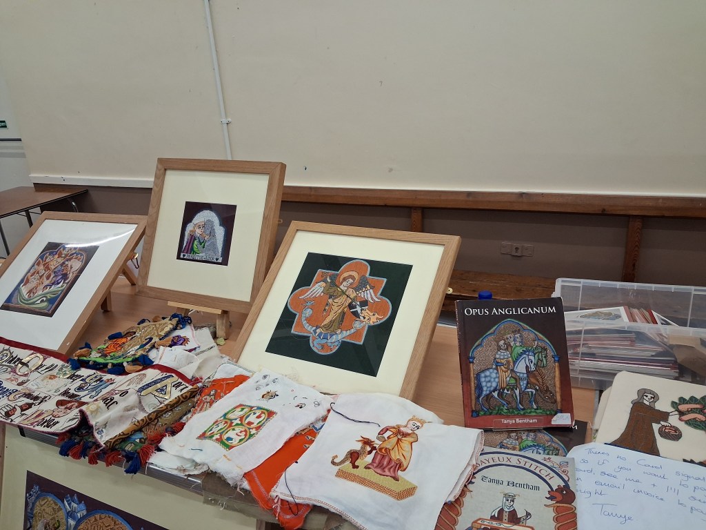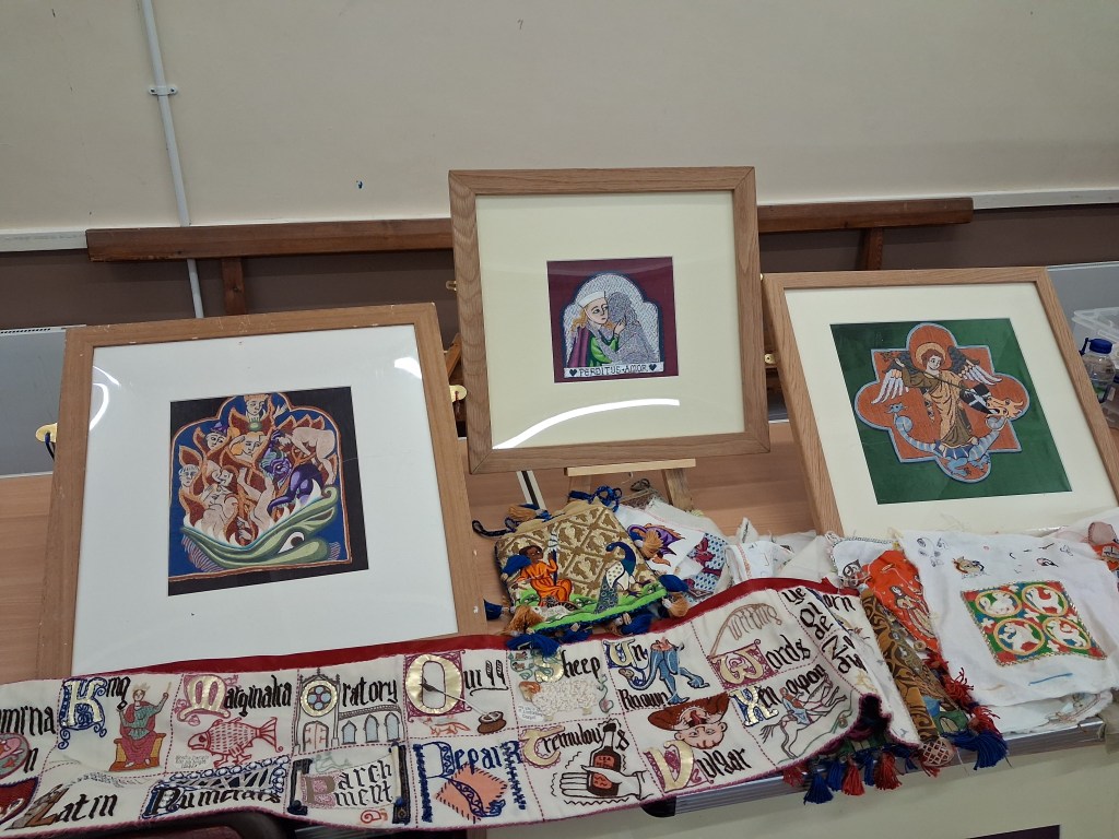 What a lovely day we had at Durham Cathedral, we split into 3 groups, each group visiting different parts of the Cathedral led by Ann, Ione and Melitta. I was in Ione’s group for the first part of our visit, Ione took us up to the Broderers workshop where the broderers embroidered beautiful Items and vestments also many of the archived embroideries all were amazing and many items which are being conserved by the broderers, we felt very privileged to be invited into the workshop.