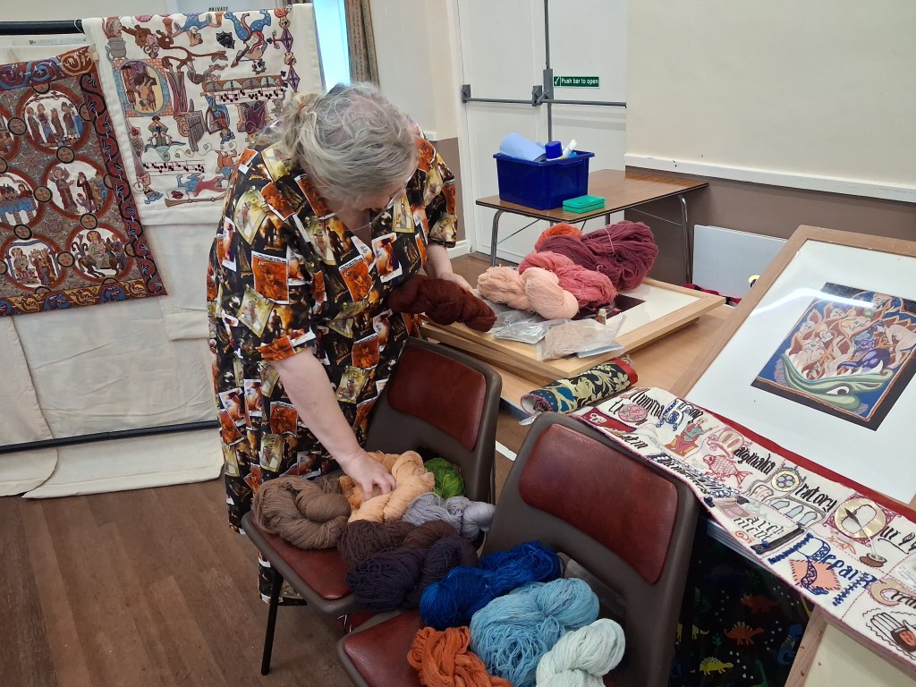 Our speaker at the February meeting was Tanya Bentham on a repeat visit to RLCS. Tanya’s theme on this occasion was the use of colour in Medieval embroidery, and we learned not only about how Tanya dyes the wool she uses in her work, but that the myth of plant dyes such as weld, fustic and madder not being as colourfast as artificial dyes was a trick by 19th century manufacturers to market their new products. Modern spectrographic analysis shows plant dyes to be washfast and lightfast when mordanted properly. Tanya spoke about the ‘language of colour’ – the significance of the colours used in original pieces from the period and the way in which a restricted palette was manipulated to create gloriously complex embroideries. She described learning to use the limited palette as liberating. Her most recent works have used counterpoint couching, the manipulating of the direction of stitches, in filament silk, to create different shades within a colour, playing with light to suggest texture and volume. There were lots of questions at the end of the talk, following which the sales table was very busy and members enjoyed seeing and handling the many examples of work that Tanya had brought with her. In my absence notes and photos kindly taken by Denise.