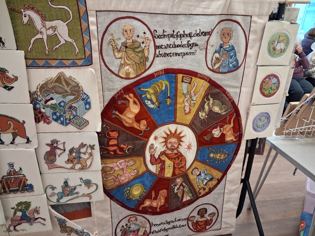 Our speaker today was Tanya Bentham with her talk entitled Medieval Embroidery. What an enjoyable talk, Tanya took us through her journey to medieval embroidery. Her embroideries cover periods from ancient Greek to the Tudor period but today’s talk mainly centered on the medieval period (whoever thought medieval embroidery was dull had another think coming!). Tanya is a prolific embroiderer and showed us many of her works which are very detailed adding a few modern references to some pieces, one piece which I particularly liked had hidden references to various rock bands, Kiss, Rolling Stones, Jethro Tull to name a few, how many can you spot in the illustration on the right? You can see more of her work on her website https://opusanglicanum.wordpress.com . I cannot wait for her workshop later in the year.